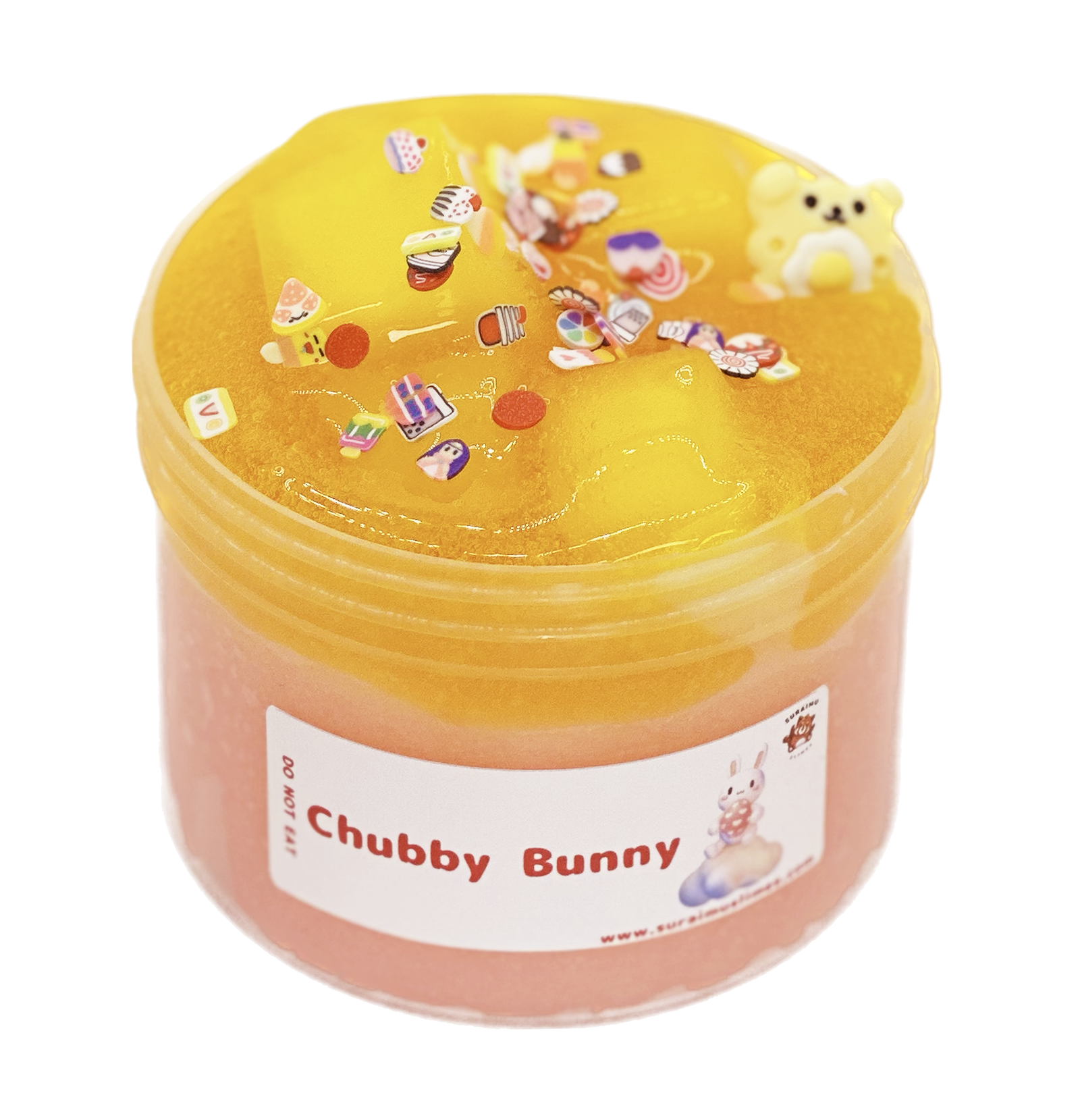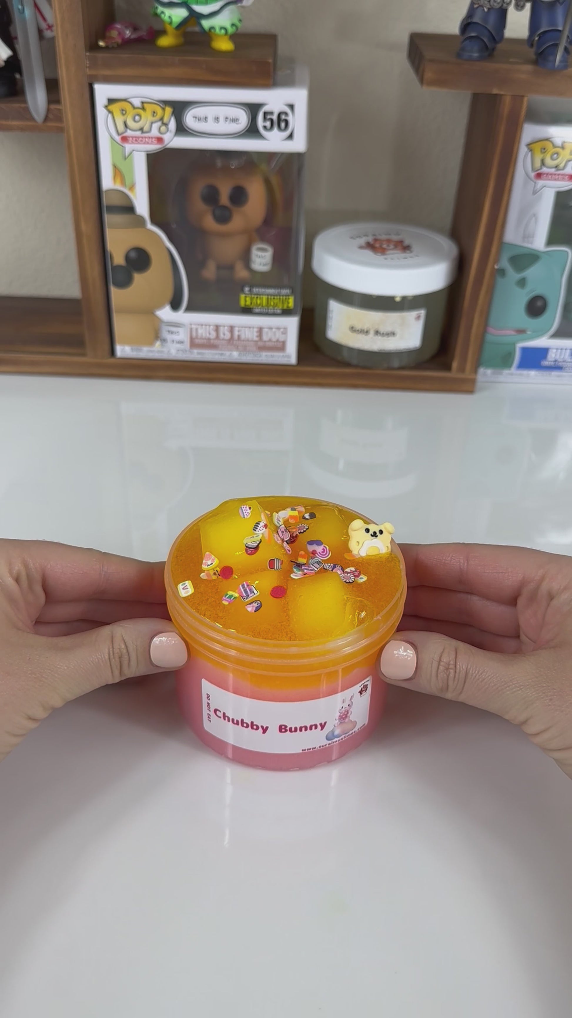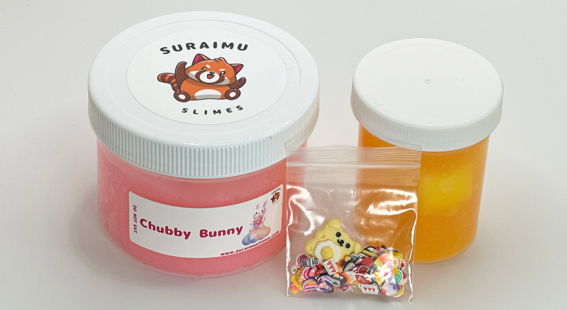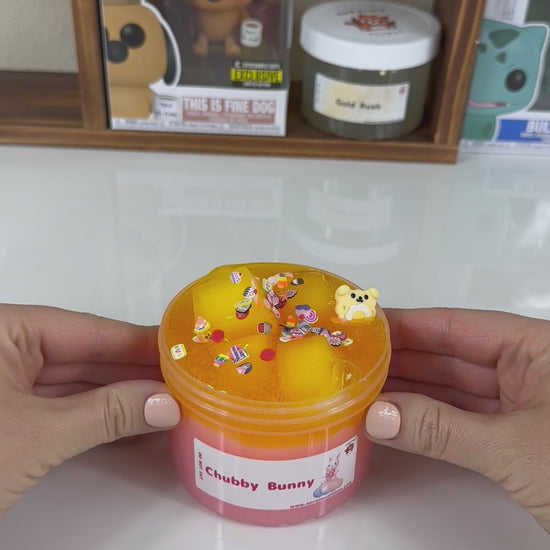 Description: Pink icee slime base topped with a yellow jelly cube slime scented with fresh peach oils.